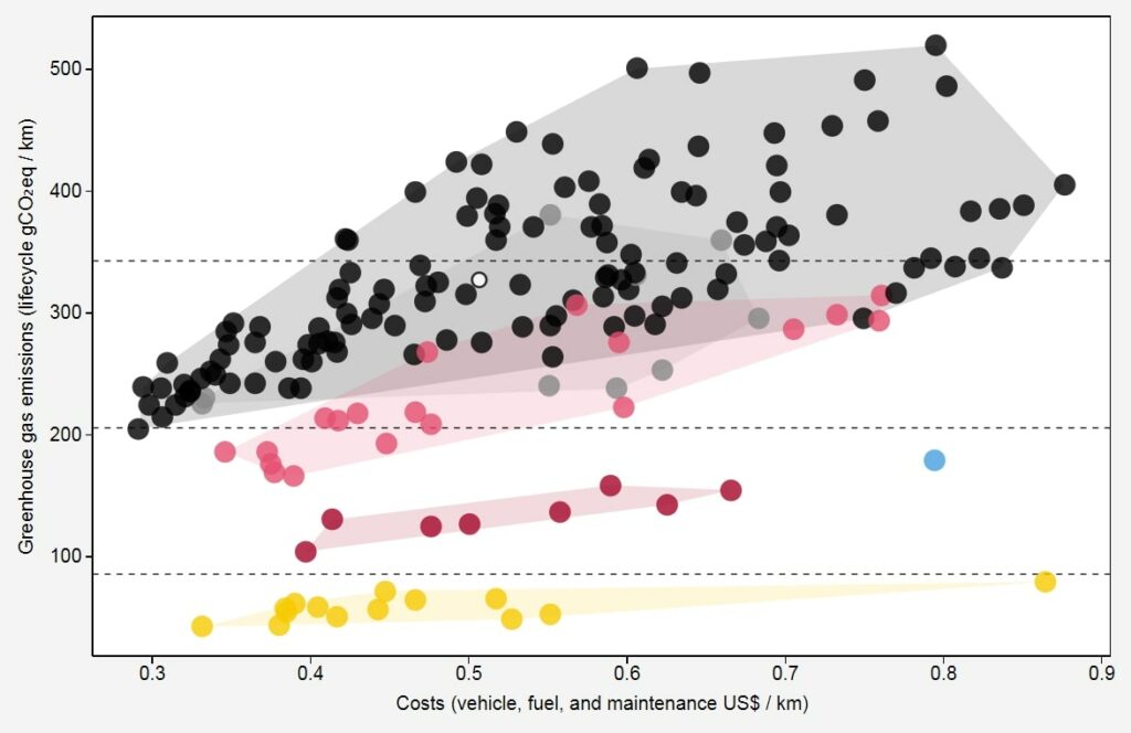 Folgende Punkte stehen bei einem Kauf eines Elektroautos kritisch einander gegenüber: Erstens die Kosten eines Elektroautos und zweitens die Umweltbelastung im Vergleich zu herkömmlichen PKWs. Das am MIT (Massachusetts Institute of Technology) entwickelte Tool «Carbon Counter» vergleicht die Gesamtkosten (X-Achse) von den gängigen Automodellen mit den Treibhausgas-Emissionen (Y-Achse) über die Lebenszeit (inklusive Batterieproduktion). Der Vergleich schafft Klarheit bezüglich dieser zwei Faktoren.